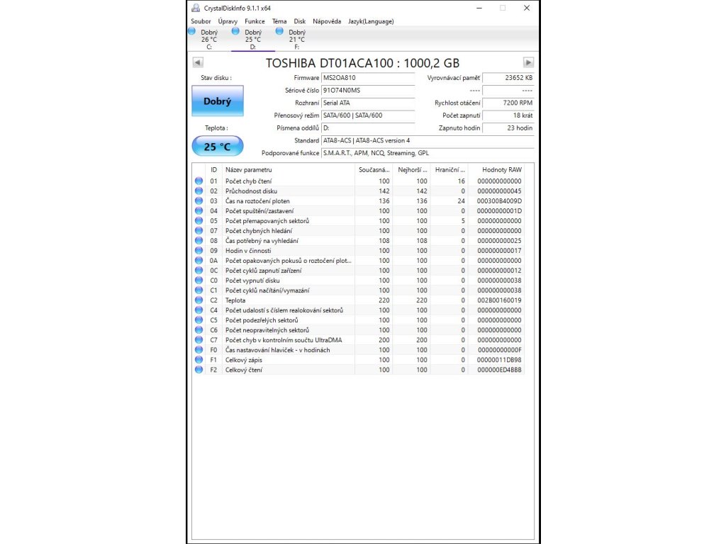 Krátkodobě použitý pevný disk HDD, pouze 18x zapnut a natočeno má jen 23 hodin. Vše je vidět v obrázku.
