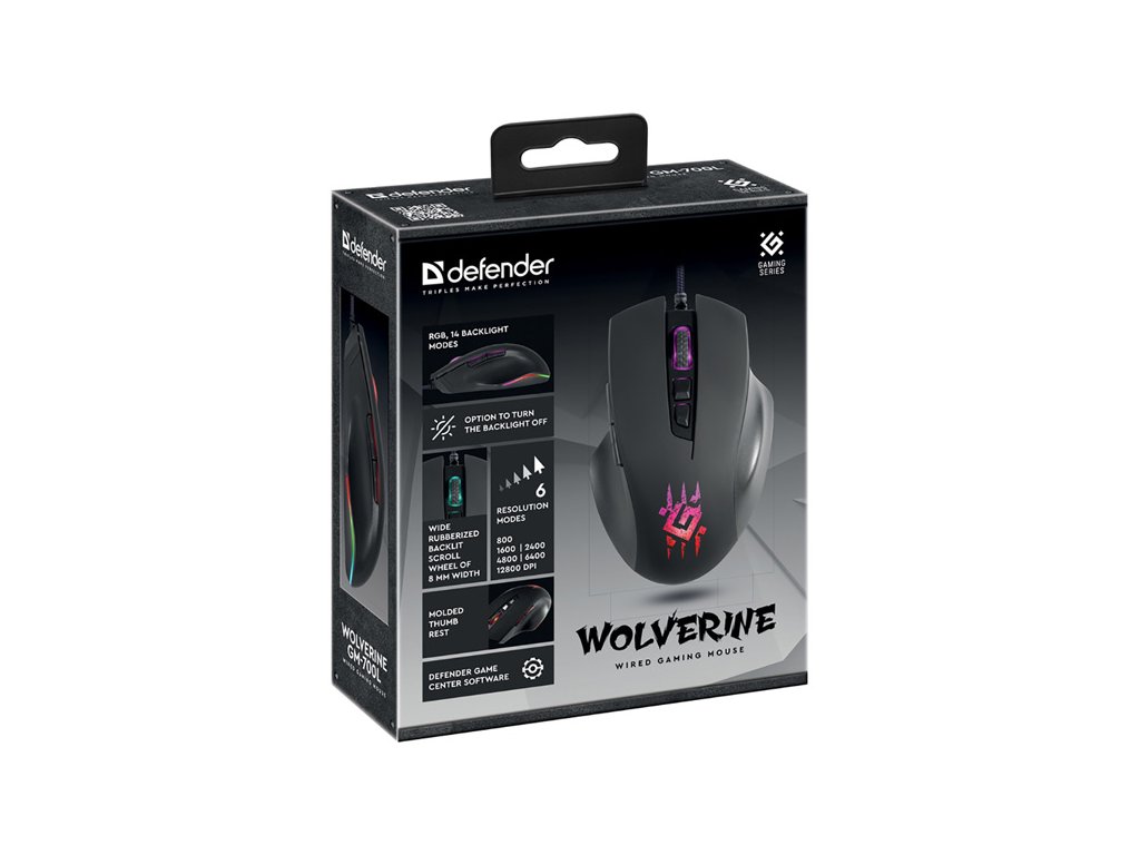 Tato myš Defender Wolverine nabízí až 14 režimů podsvícení a díky Software Defender Game center editor lze nastavit barvy podsvícení podle svých potřeb tak jako užitečné makra pro vaše hry. U myši lze nastavit až 6 režimů rozlišení a myš si udržuje stabilní výkon i při vyšších rychlostech. Určitě potěší speciálně tvarovaný úchop pro palce a pogumované podsvícené kolečko. O dlouhou životnost se postará opletený kabel, který zaručí bezproblémový chod na dlouhé roky.